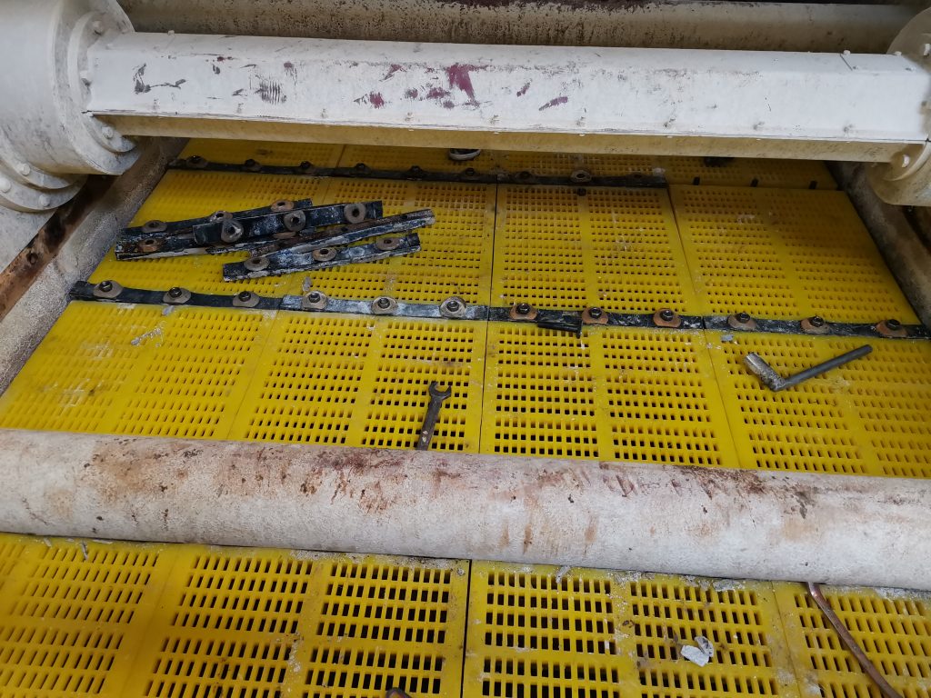 ? ? 2019年12月,南昌鑫力技術人員走訪宜春鉭鈮礦時,了解到現場使用的一臺2460直線篩具有篩網堵孔、使用壽命低等影響篩分效率的問題,這個問題困擾了宜春鉭鈮礦的工作人員近十年,為解決篩網問題,他們先后使用過金屬沖孔篩網、不銹鋼條縫篩網、TDI聚氨酯篩網,但都是“治標不治本”。